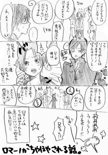 フェリばかり可愛がられて「どうせ」って拗ねたら他から「えっロマも可愛いよ」って口々に言われて恥ずかしくなり、フェリを褒めた面々に突き飛ばして逃げる